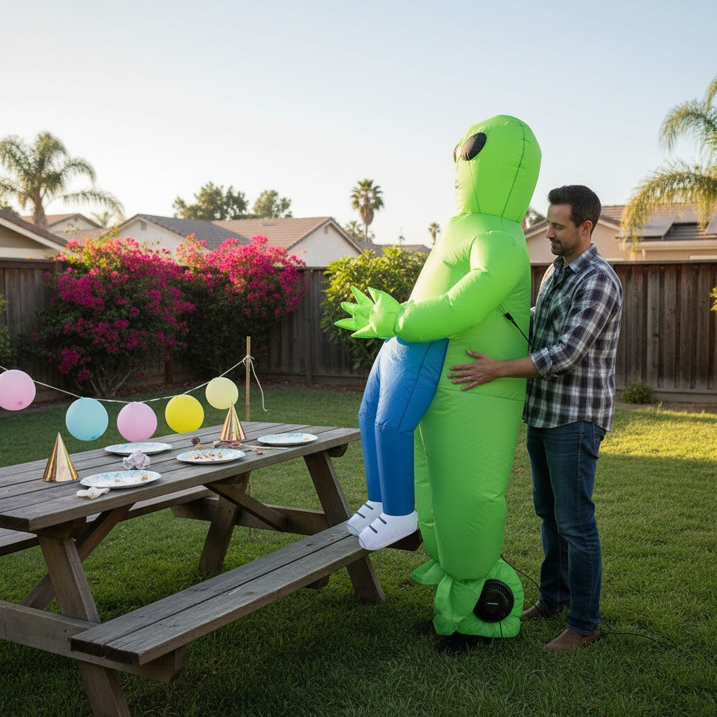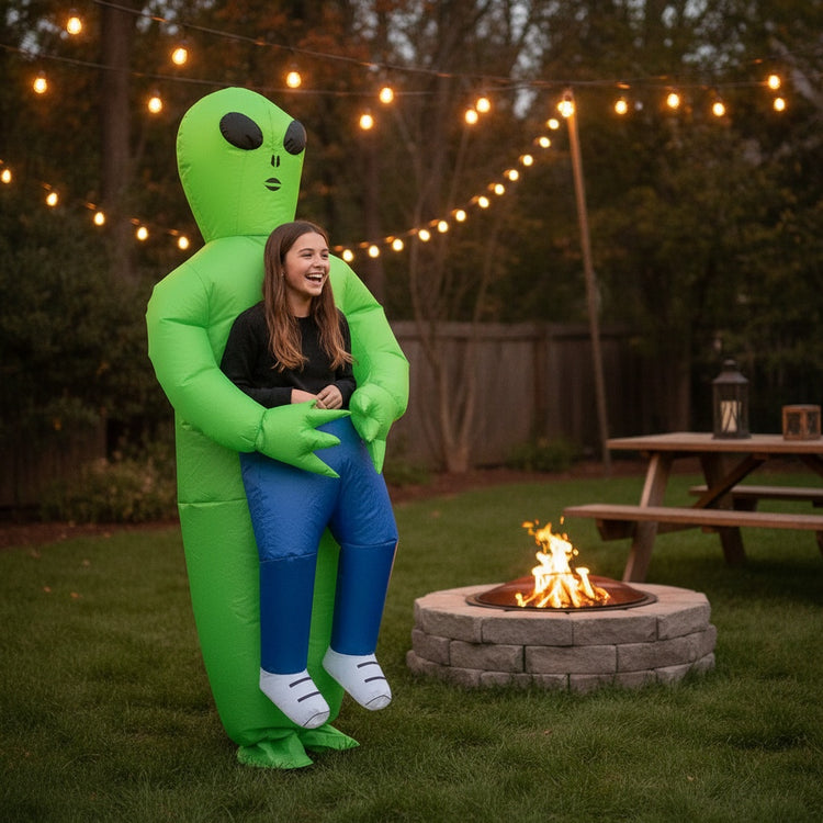 Our Inflatable Alien Abduction costume features a silent battery-powered fan for instant inflation, lightweight breathable fabric, and adjustable hook-and-loop straps. The rip-resistant design ensures lasting fun both indoors and outdoors.